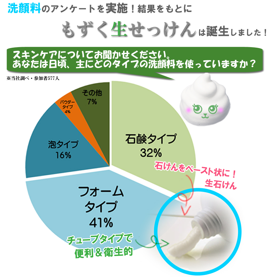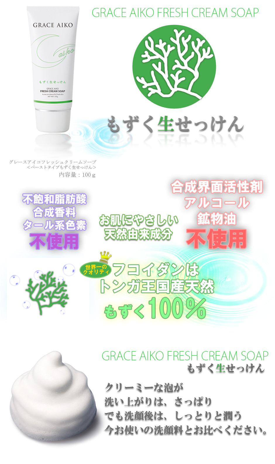 グレースアイコのもずく生せっけんはそれらの悩みを解消。独自の技術により、チューブタイプの生石鹸として誕生いたしました。